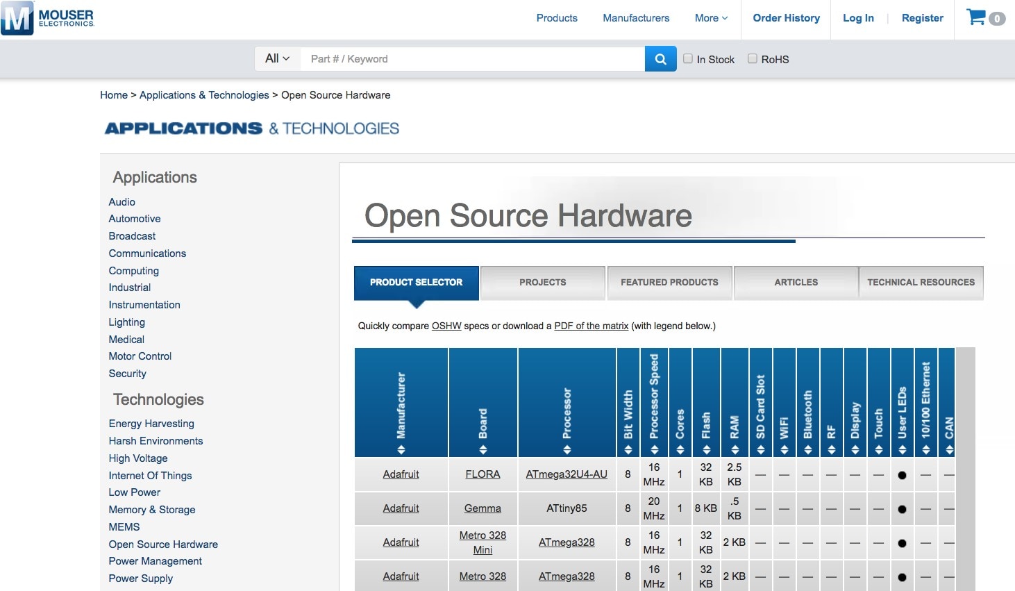 Figure 1: Mouser’s Open Source Hardware site lists great hardware for summer and year-round electronics projects. (Source: Mouser.com)