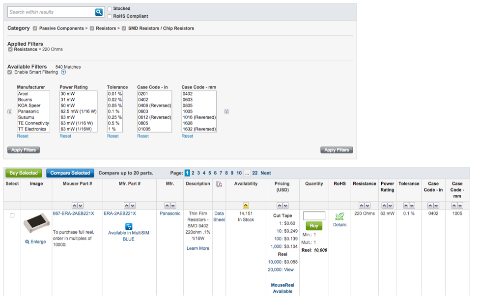 4.     Footprints: Nothing is worse than selecting a component only to discover that the component is not available in my CAD tool library. Now when I search Mouser for components I always look for the “Available in MultiSIM BLUE” icon.